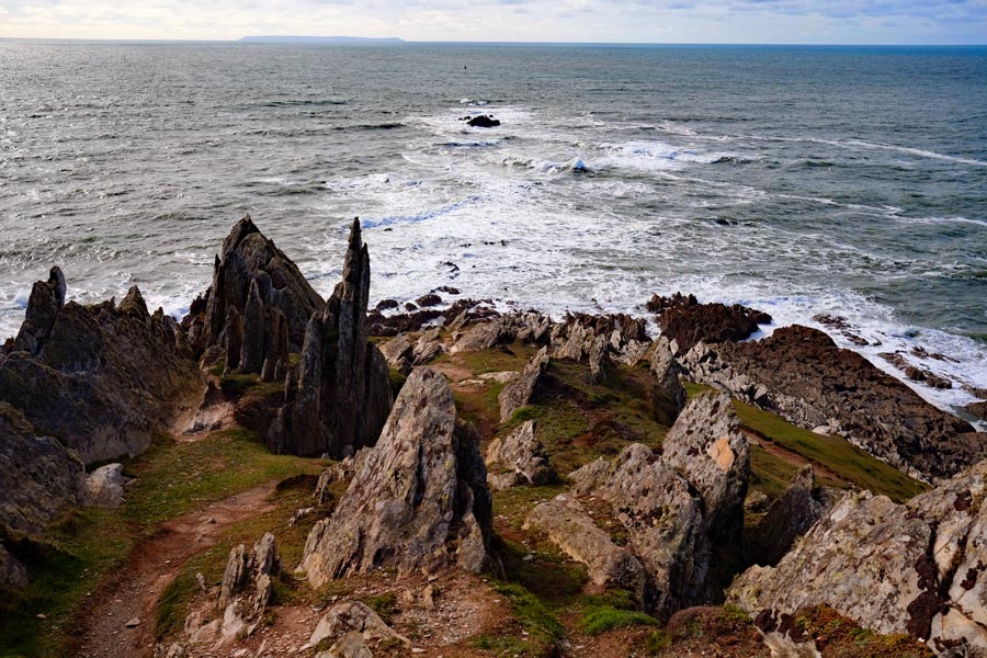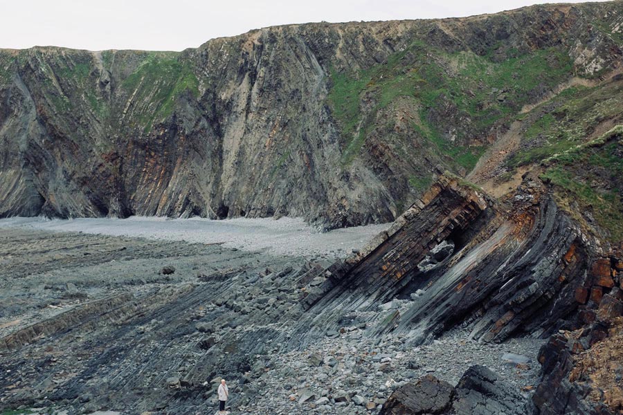 Inclined rock plates near Hartland Quay. Day walk March 2004.