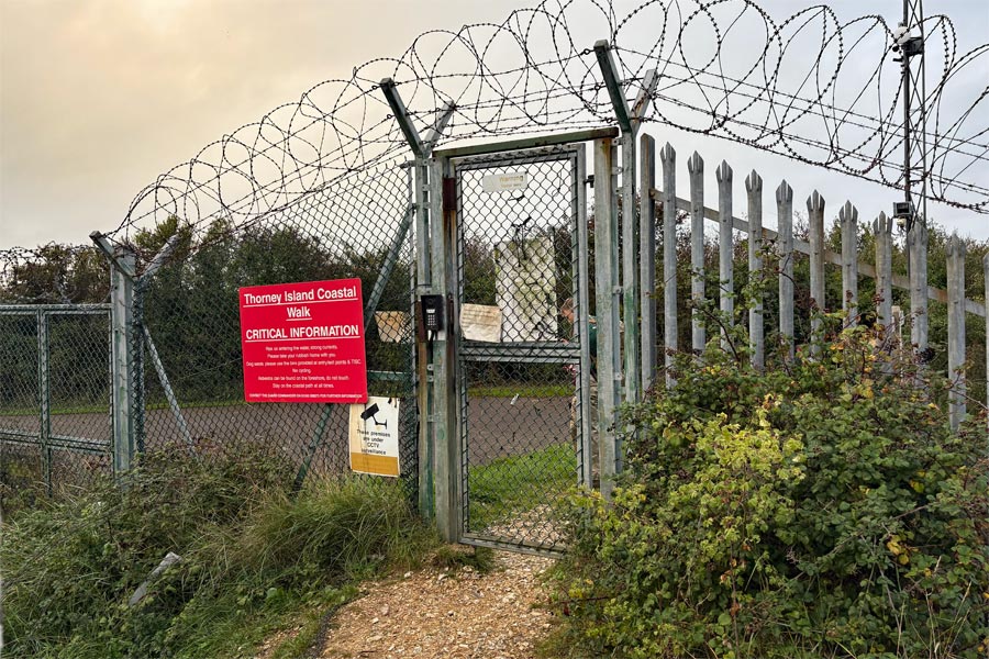 For the walk around the island I was using part of the Sussex Border Path as the island was not on the England coast Path. Heading south from Emsworth the path first threaded its way through the marina between the rows of laid-up boats. It was sign-posted but I found myself following several dog walkers ahead of me. The weather was promising with patches of blue sky appearing. It wasn't very long before the dog walkers veered off to the left their regular poop loop, leaving me to continue along the water's edge. Once again the tide was out so there were mud flats stretching away to my right. The path had good views of the Emsworth Channel as it was along the top of the sea defences. After about a mile I came to the Great Deep, a large channel that completely bisects the promontory, crossed only by the seawall. I assume that there was opening or a sluice below to allow the tide to flow through. After crossing the channel I came to a barbed-wire topped fence and a gate. There was a warning sign stating that there were no facilities of any kind ahead and that walkers requesting to continue must keep to the path around the edge of the island. I pressed the intercom button and made my request to the guard room, somewhere on the island. There were no buildings nearby. I was warned to keep to the path, and then I heard the gate unlock.