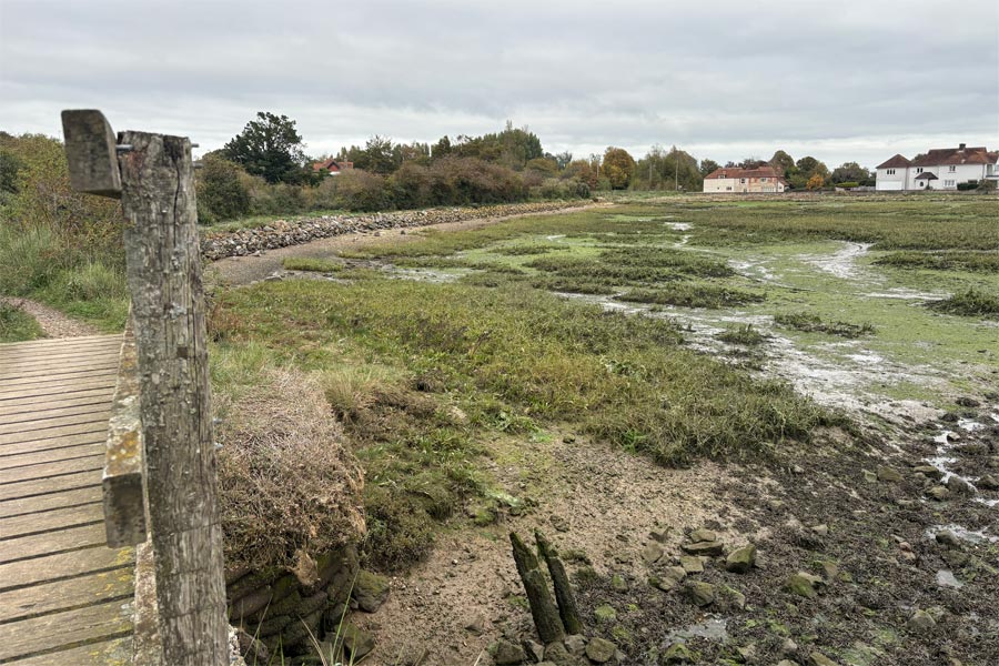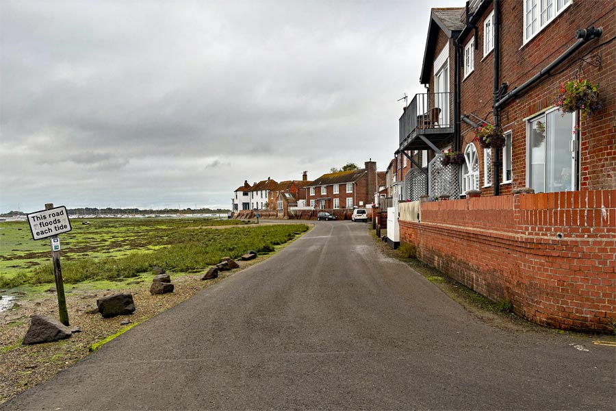 I returned by bus to the point on the A259 that I had reached the day before and walked the short distance to the start of the footpath to Bosham. Once again the morning was bright but cloudy and the tide was out. Along the banks of the Bosham channel there were several interesting and abandoned quays and slipways. At the centre of Bosham, the houses along the waterfront were on a raised bank above the road which had a warning notice about the road becoming submerged during some high tides. Here I stopped at the Shoreside Cafe for a coffee and to check my onward route.