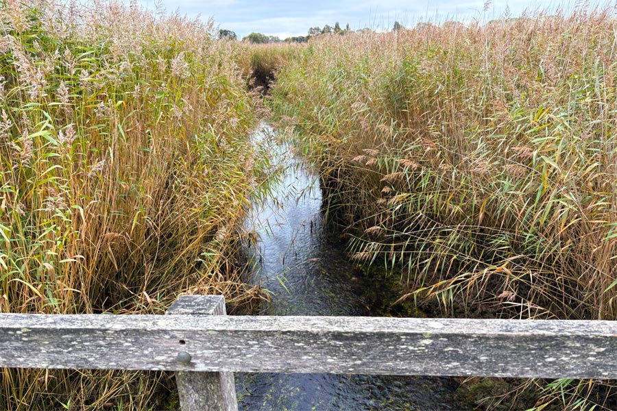 The path remained along the top of the sea defences bank. Inland there was a ditch and a fence and beyond that there were fields with cows grazing. After just over a mile the path arrived at Walker Point. Less than a mile further on the bank became impassible due to dense bushes and the path was sign-posted slightly inland. I came to a path with high hedges on both sides where there were two soldiers and an impressive military vehicle parked touching both hedges. I thought that I had taken a wrong turn. When I enquired, I told that I was on course and to just squeeze past the monster. After a while the track became an open pathway again. At Pilsey Sand there was a white sandy beach which I started to walk on but a sign warned that the beach was restricted for bird protection purposes. I took the path that turned away from the beach and arrived at Longmere Point where, shortly afterwards, the path turned northwards along the Thorney channel.